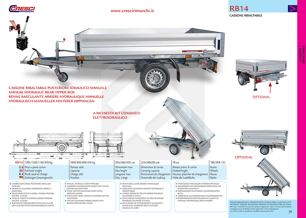 Carrello / rimorchio Cresci Rimorchi RB14 dodato di cassone posteriore ribaltabile idraulico manuale e sponde apribili o smontabili alte 35cm. Ideale nell' ambito edilizio ed agricolo.